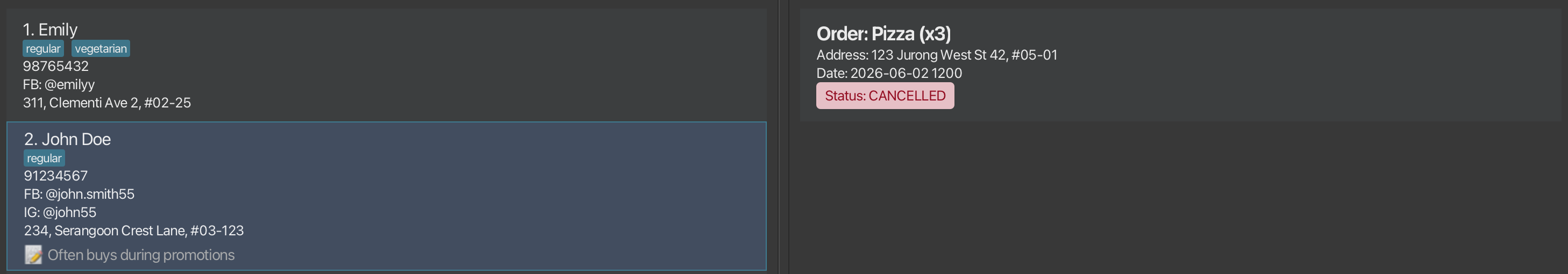 | Add Order | order INDEX i/ITEM_NAME q/QUANTITY at/DELIVERY_TIME [a/DELIVERY_ADDRESS] [s/STATUS] e.g. order 3 i/Pizza q/3 at/2026-04-02 1200 a/123 Jurong West St 42, #05-01 s/PREPARING |