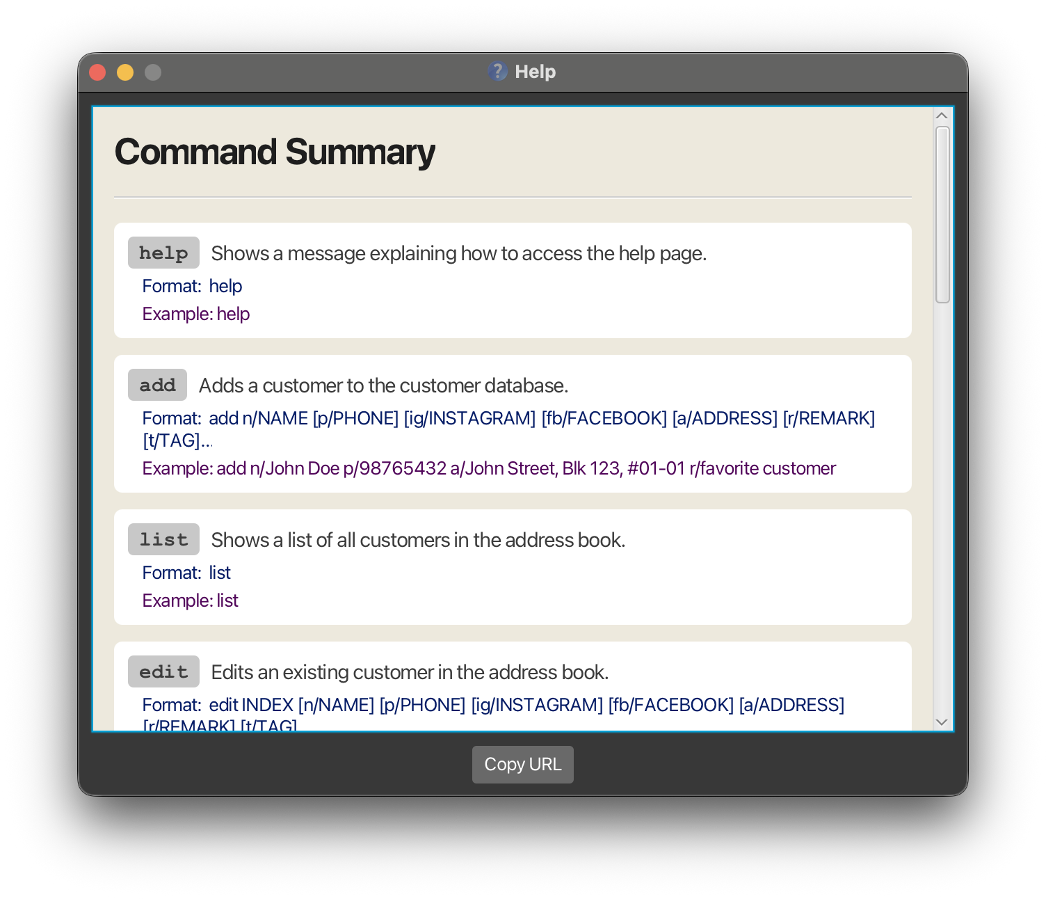 | Edit | edit INDEX [n/NAME] [p/PHONE_NUMBER] [fb/FACEBOOK] [ig/INSTAGRAM] [a/ADDRESS] [r/REMARK] [t/TAG]… e.g. edit 2 n/James Lee ig/jamesLee |